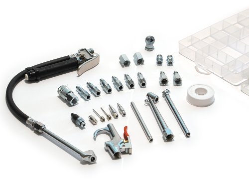 - Includes 2 couplers, 11 plugs, dual air chuck, ball chuck, tire gauge, 2 inflation needles, PTFE tape, 4 hose fittings