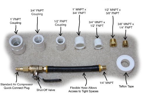 One end of the adapter has a quick-connect plug designed to connect to most air compressors. The other end can be customized into five Male National Pipe Thread (MNPT) connections (1/4" MNPT, 3/8" MNPT, 1/2" MNPT, 3/4" MNPT, and 1" MNPT) and three Female National Pipe Thread (FNPT) connections (1/2" FNPT, 3/4" FNPT, and 1" FNPT,) to fit most home underground sprinkler systems. We ship from Andover, Kansas, USA. As a Better Business Bureau Accredited Business, we are committed to the highest ethical standards of business conduct.SUPER FAST SHIPPING! ALL ORDERS ARE SHIPPED WITHIN 12 HOURS, MOST DELIVERED WITHIN 1-3 BUSINESS DAYSWinterize Sprinkler System Adapter: Air Compressor to National Pipe Threads (NPT) Set with Shut Off Valve - Contains all common sizes! Features